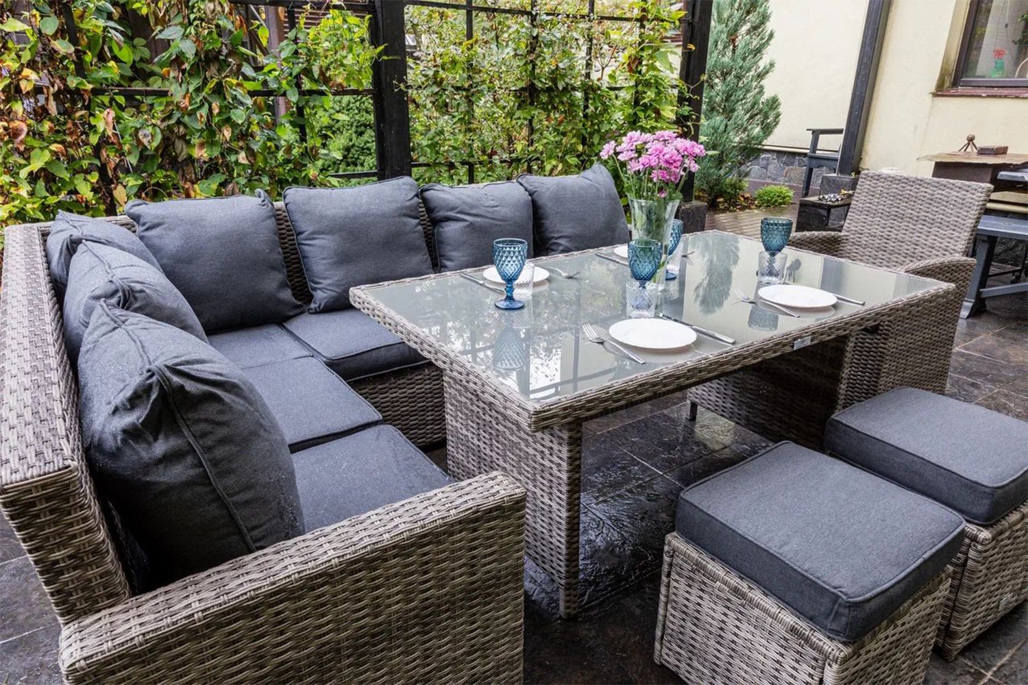 Увеличенный набор мебели для сада Хорро плюс включает в себя просторный угловой диван, два пуфа, и дополнительное кресло – теперь на улице сможет собраться за одним столом большое количество человек, на какое-либо мероприятие, или же просто для приятного времяпрепровождения в летние дни или зимние праздники.