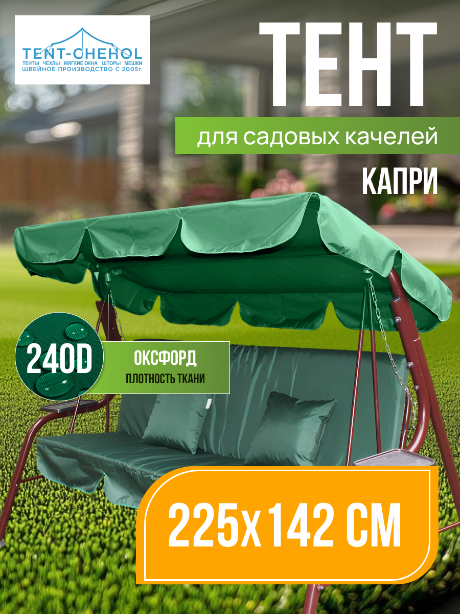 У нас вы можете купить тент для качелей Капри. Это долговечный тент, имеющий выгодную цену, а также сертификат качества. Это очень прочная крыша, которая отличается легким снятием и установкой, при необходимости её можно очистить, она является долговечной. Данный тент для качелей - это важный садовый аксессуар, который предназначен для того, чтобы защитить от атмосферных осадков, опадающей листвы, насекомых и птиц. Размеры тента составляют 225 х 145 см, вес 0,6 кг, выполнен тент в зелёном цвете. У тента есть фурнитура, благодаря чему его легко закреплять.